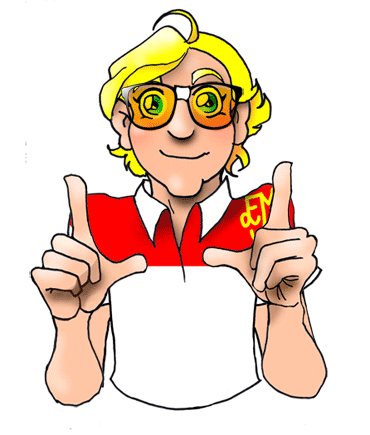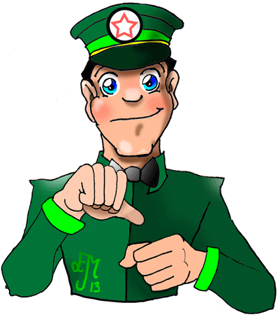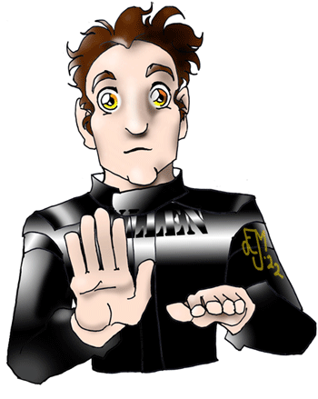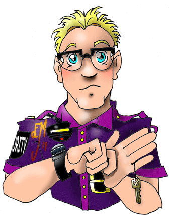 My ASL Dictionary’s cartoon of ASL instructor Paul Johnson dressed as a Security Guard shows the ASL hand sign for KEY.